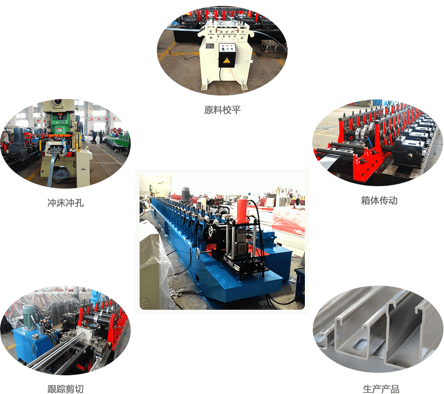 開卷→動(dòng)力整平→儲(chǔ)料→CN伺服送料+自動(dòng)沖孔(沖LOGO)→儲(chǔ)料→輥壓成型【夾送引料→滾壓鋸齒→輥壓成型(噴淋冷卻)】→伺服跟蹤剪切(或鋸切)→出料→落料